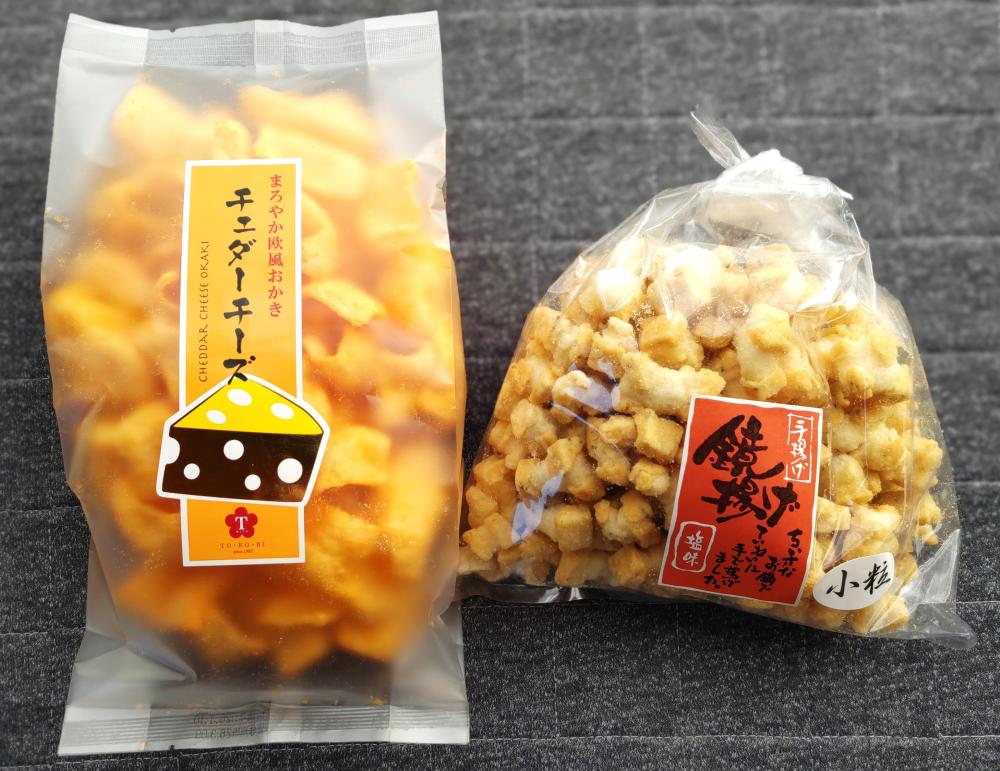 看板商品の「鏡揚げ(小粒)」を購入しました。鏡揚げは、醤油・塩・黒こしょうの3種類ありますが、個人的には「塩」が一番好きです。食べ始めたら止まらないほどのおいしさです。 袋で購入すると698円ですが、容器のポットで購入すると798円です。 もう一つ、チーズのおかきを見つけたので購入しました。おかきとありますが、原材料は小麦粉です。チーズ味のスナック菓子のような軽い食感でおいしいです。(298円)