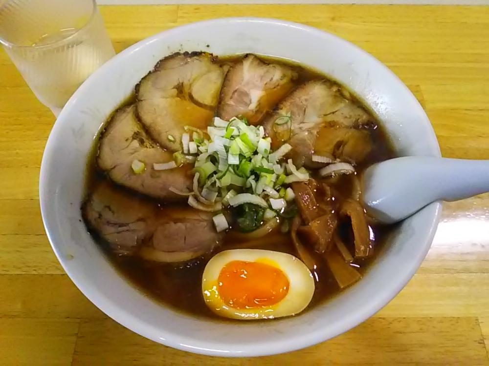 また久しぶりに平日昼に再訪です。入口の券売機は依然として紙幣投入口が故障中で、ご主人が500円玉2枚で両替してくれました。今回は醤油チャーシューメンを選んでカウンター席へ。前客2人・後客1名とやや寂しいかな。静謐の中で丼到来。ツルモチ太麺が醤油スープに浸り、縁が焦げ茶色で3-5mm厚の豚ロース叉焼5枚、メンマ、半熟味玉(半切半個)に刻みネギが麺上に載っています。豚・鶏の味わいのある醤油スープは熱々でかなり美味しい。また叉焼は量が多くて食べ応えがあり、あっと言う間に完食完飲でした。