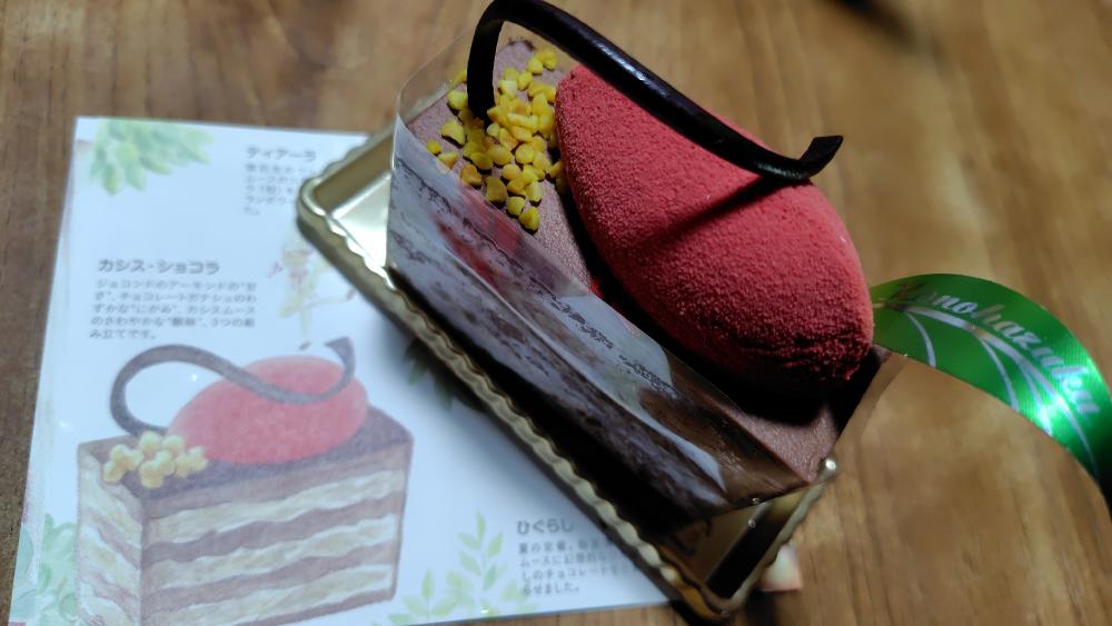 ここのケーキをお土産にいただきました。カシスの酸味とチョコレートの甘さがピッタリで、とても美味しかったです。高級感がある見た目で、とても凝っているケーキです。他のケーキも食べてみたいです。