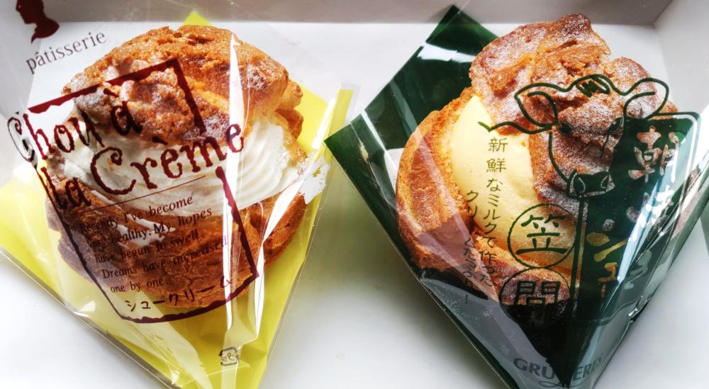 2種類のシュークリームをいただきました。生クリームを詰めた一般的なシュークリームと、カスタードクリームを詰めたクッキーシューです。クッキーシューは「朝焼き パリジャン」という商品名です。どちらもクリームたっぷりでおいしかったです。