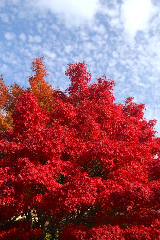 11/16 西山の里のモミジが真っ赤に色付きました。晴れ渡った空には巻雲が流れ、モミジとのコントラストが美しかったです。