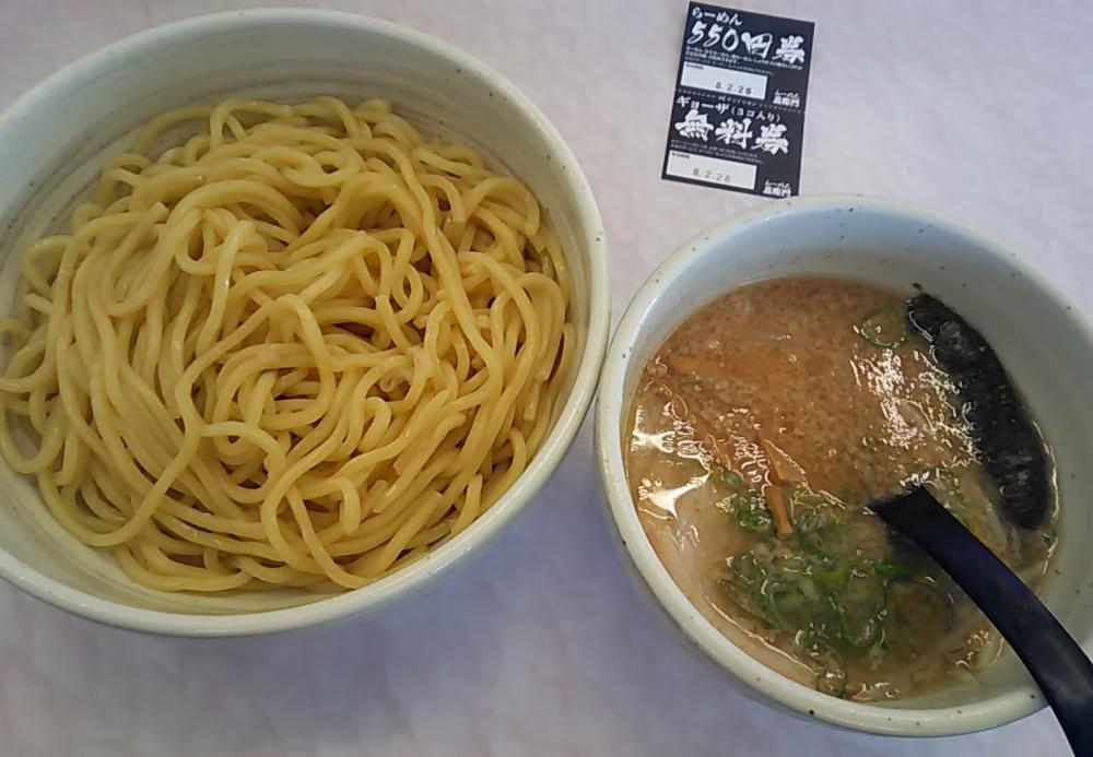 大晦日の昼に再訪し、らーめん550円券で「しょうゆつけ麺」を麺固め、油・味普通で注文しました(中盛無料なので中盛として)。到来した麺丼には良く冷やした極太麺のみでトッピング無しです。ペアの熱々つけ汁は背脂が多く浮く豚骨醤油ベースのもの。入っている具は約3mm厚の豚バラ巻叉焼1枚、板海苔1枚、メンマ、刻み青ネギにもやし。つけ汁の味が良く、中盛麺をあっという間に完食しました。続いて割スープ(急須入り)をもらうと、これは白濁した豚骨スープ。つけ汁を割って美味しく完飲となりました。
