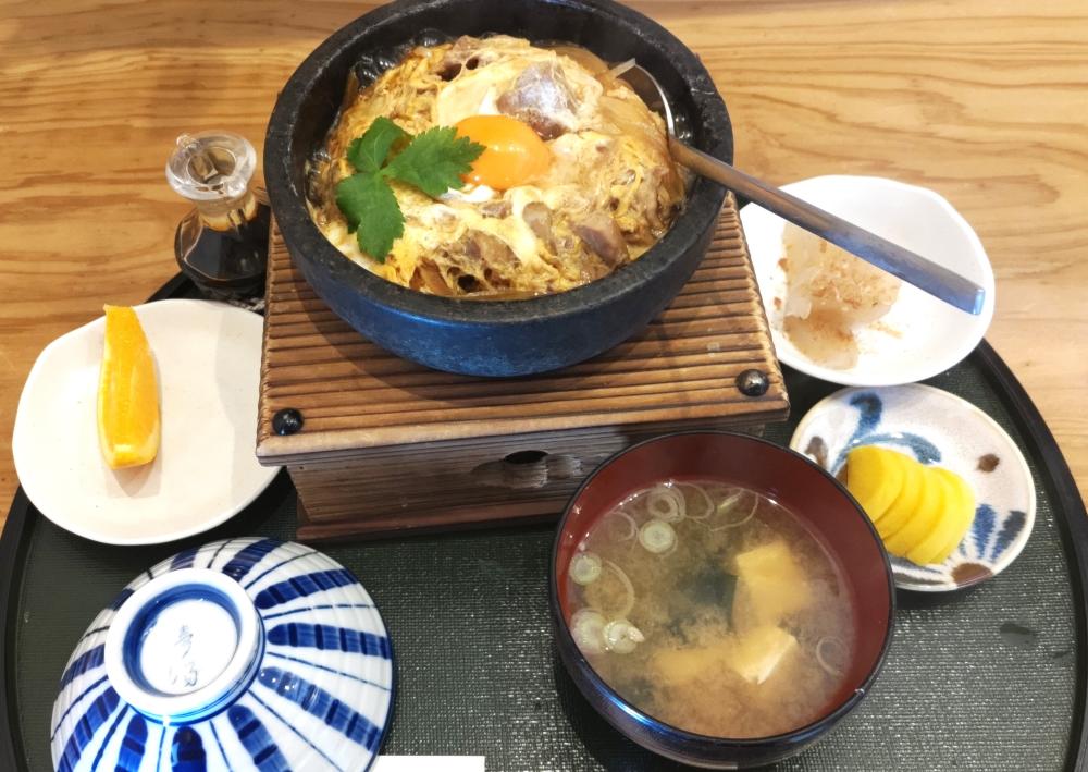 「奥久慈しゃも石焼き親子丼」をいただきました。しゃも肉を卵でとじたものがのっていましたが、さらに生卵がのっていました。店員さんから「お焦げができてしまうので、よく混ぜてください。」とお話があったので、生卵とごはんをよく混ぜていただきました。ごはん全体に出汁が染みていて、最後まで冷めることなくおいしくいただくことができました。しゃも肉も結構入っていて、食べ応えがありました。(1,500円)