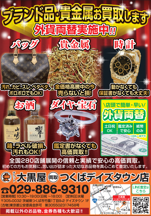 日本全国に280店舗以上の実店舗を構えている「オレンジの看板」でおなじみの大黒屋でございます。茨城県つくば市の買取店・リサイクルショップとして、つくば市を中心に牛久市、常総市、坂東市、石岡市、筑西市、下妻市、小美玉市、つくばみらい市、取手市、稲敷市、阿見町、鉾田市、かすみがうら市、行方市、桜川市、筑西市、稲敷郡、阿見町などにお住まいの方々に広くご利用いただいております。主な買取品目は金・プラチナの貴金属、ダイヤ・宝石、ルイヴィトン・シャネル・エルメスなどのブランドバッグ、ロレックス・オメガなどの腕時計、ティファニーなどのジュエリー、記念金貨、お酒、商品券などです。外貨両替も行っております。