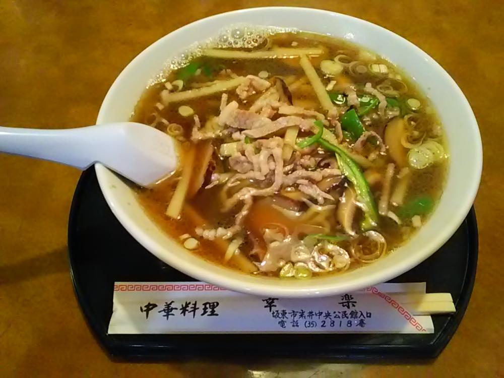 今月初旬の土曜夜に初めて訪れました。地元に根付いた町中華の様相で、演歌歌手ポスターを壁に何枚も貼ってあるところや、長卓席・ボックス席等の調度に昭和の雰囲気を色濃く感じます。限定品「タン塩ラーメン」に心惹かれましたが、生憎と売り切れのため、代わりに「肉細切りそば」を注文(焼ギョーザ(6個)も追加)。到来したラーメンは縮れ平打ち中太麺が醤油清湯に浸るもの。これに細切りの豚肉・ピーマン・シナチク・椎茸の炒め物がかかり、刻みネギが散らされています。鶏ガラ出汁の旨味でなかなかに美味しい。焼ギョーザはニンニクの香りと味わいがやや立っていますが、まあ普通でした。