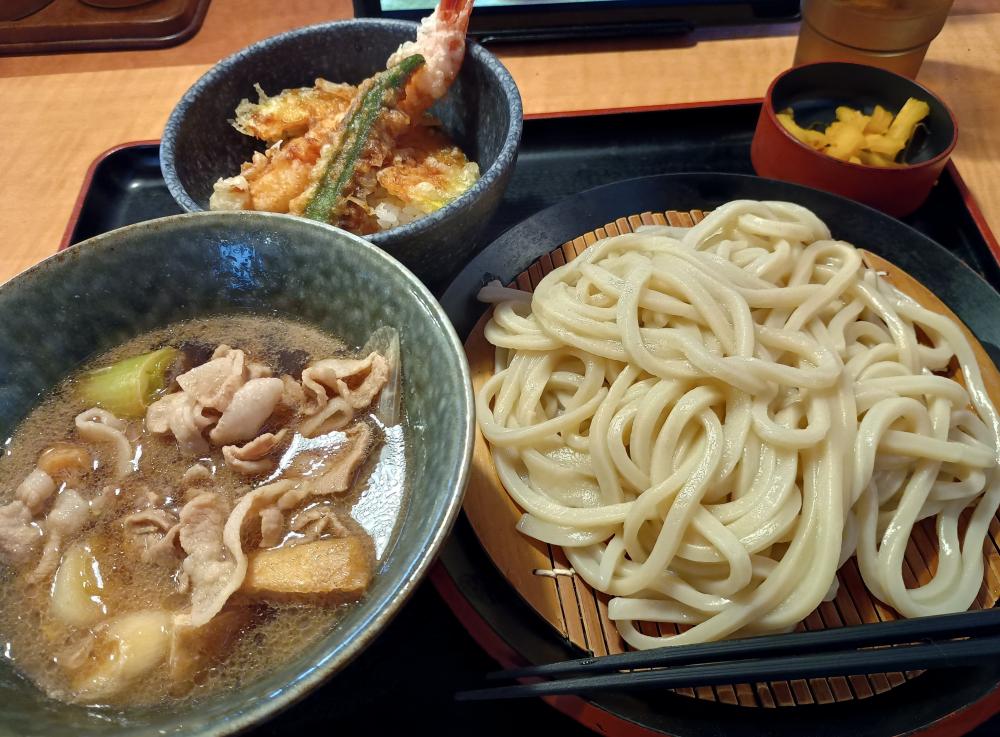 近くまで来たので、平日のお昼に2人で来店しました。 11時と早いため、店内には数組しかおらず、キャパもあるのですぐに着席できました。 注文は前回から決めていた肉汁つけうどんがランチメニューにあったので、プラス天丼セット979円(込)にしました。 今回、寒かったのでうどんを温盛にしたのですが、うどんは冷たい方が締まっていておいしいと思いました。 肉汁は、豚肉、厚めの油揚げ、太目のネギが入っていて、肉の脂とやや濃いめの汁で、うどんがおいしく食べられます。 天丼は、えび、かぼちゃ、おくらが載っていて、これに漬物がセットです。 見た目は量が少なそうでしたが、食べてみるとつけ汁も案外、具が多くて、天丼もうどんもしっかりしていたので、けっこうお腹いっぱいになりました。 店内が広くて、味量価格のバランスが良く、店員さんたちも感じが良いので、近くに来たときには、また利用したいと思います。