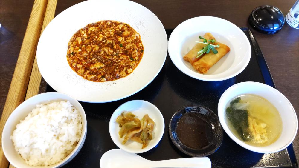 「陳マーボーランチ」をいただきました。麻婆豆腐の他、本日の副菜としてミニ春巻き、漬け物のザーサイ、ごはんとスープがついて、1,100円。 麻婆豆腐は、豆腐が結構崩れて小さくなっていましたが、味の方は、適度な辛さがありおいしかったです。ミニ春巻きもおいしかったです。