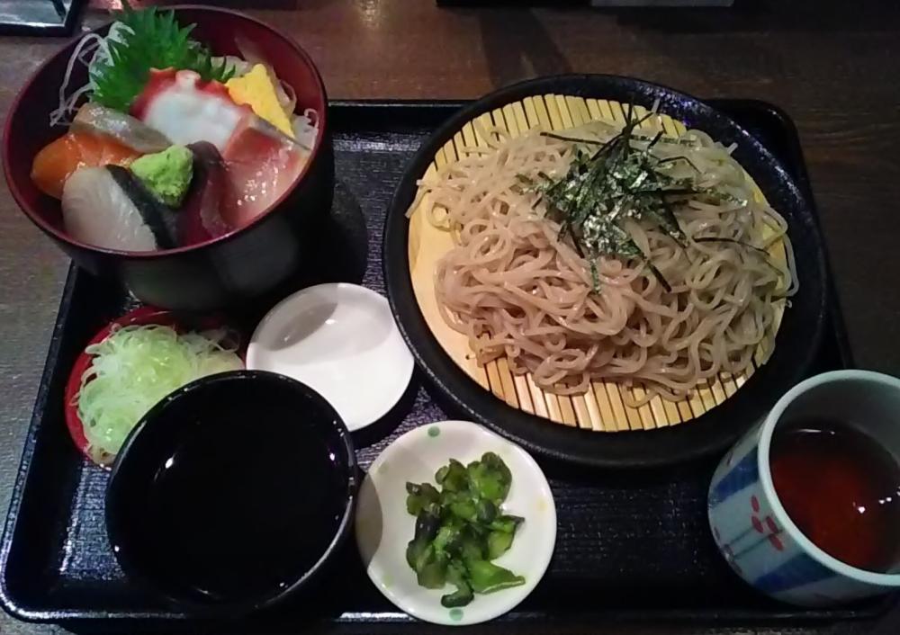 連休の昼に久しぶりに再訪。こちらも卓子ごとにビニール仕切板が立てるなど対策中です。そばセット海鮮刺身丼(小)を注文。そばは平日昼・土日祝日は大盛無料とのことで、大盛ざるそばにしてもらいました(大盛無しですが、そばはうどんにも変更可とのこと)。平膳には切り海苔をかけた細麺のざるそば、そば猪口1杯分のつけ汁、薬味ネギ・ワサビ小皿、キュウリの柴漬、それに海鮮刺身丼(小盛の酢飯の上に中トロマグロ/サーモン/イクラ/シマダイ/タコ/厚焼玉子/ガリ・大葉)が載っています。そばはごく普通ですが、つけ汁は鰹出汁が利いていて普通に美味しいです。また海鮮丼は小ぶりながらネタがそこそこ良い(その分、通常のそばセットより割高設定)。〆にそば湯をもらって完食完飲でした。