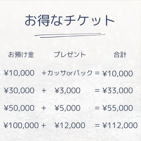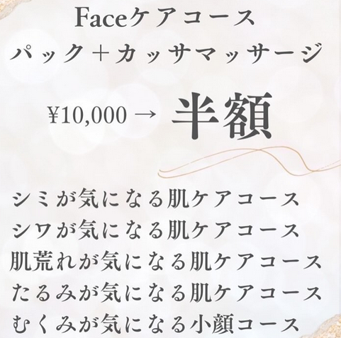 さらに、お好みで選べるプラスオプションも充実!カッサマッサージは+1,000円でリフトアップ効果が期待でき、選べるパック付きは+1,500円でお肌の悩みに合わせた特別ケアが可能。贅沢にデコルテまでケアしたい方には、カッサ+パック+デコルテのフルセット(+2,500円)がオススメです。