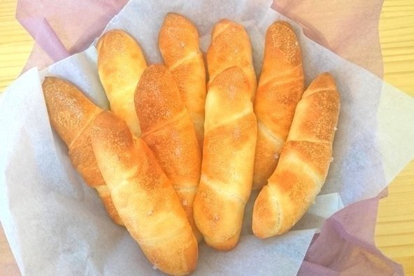 ◆塩ぱん ⚪たっぷりのバターと二種類の岩塩を使い焼き上げています‼外はカリッ、中はしっとり弾力のある生地に仕上げています。リピーターが多くとても人気のパンです❗