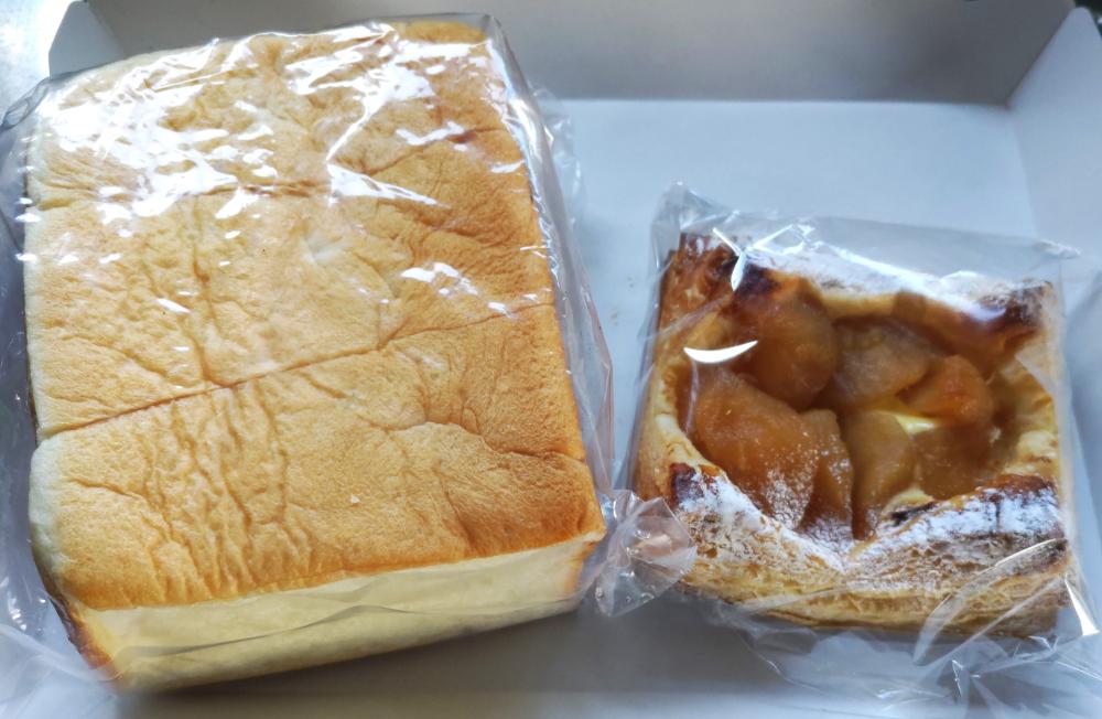「シルクタッチ」のハーフと「アップルパイ」を購入しました。シルクタッチは、牛乳や生クリームを加えて焼き上げた食パンで、きめ細かくしっとりとしていました。トーストしてそのままでも、おいしくいただけます。アップルパイは、パイ生地の上にカスタードクリームとりんごがのっているもので、甘さ控えめのパイでした。 シルクタッチ(ハーフ)250円、アップルパイ400円。