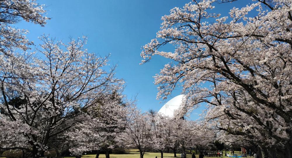 パラボラアンテナに向かう桜並木が満開でした。天気も良く、青空をバックにきれいな桜並木の写真が取れました。パラボラアンテナも間近に見ることができ、その大きさに驚きました。 4/18(土)には、アンテナ施設見学会や講演会が無料で開催されます。