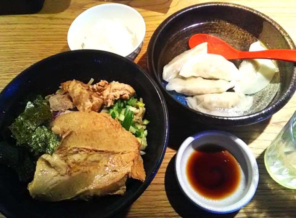 今月下旬の平日昼、開店からまる3ヶ月は経った「麺処栄秀」へ再訪です。女子グループ・女子独り客も多く入っており、相変わらず盛況のよう。今回は「煮干しまぜそば(追い飯付き)」とクーポン水餃子を注文し、カウンター席に着きました。ウォーターサーバのレモン水を飲みつつ、10分ほど待って水餃子到来。約8cm幅の大きめの餃子5個がお湯に浸かっており、肉の多い餡もたっぷり。肉汁が染み出しているのか、お湯にも淡い味が付いていました。次いでまぜそばと追い飯が一緒に到来。極太麺が少量の煮干し醤油ダレに浸り、1cm超厚の大きな一枚板の豚バラ叉焼1枚と角切り豚バラ叉焼数個、刻み紫タマネギ、刻み青梗菜、刻み四角海苔が麺上に載っています。煮干し醤油ダレの旨味が強く、混ぜた麺が実に美味しい。大きな叉焼にも満足し、さらに追い飯を投入して余さず食べ尽くしました。肉の充実した水餃子と合わせて満腹です。