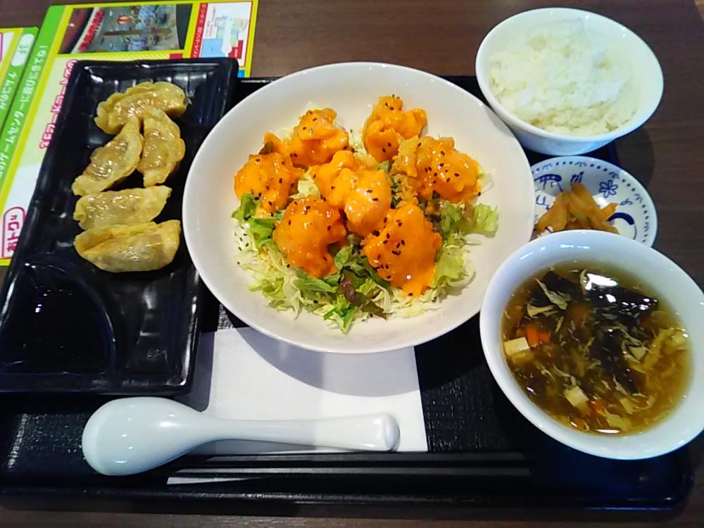 松の内の平日昼に再訪です。世間的にはまだ冬休みなので、フードコートには子どもも多く、かなり混雑しています。店前でまた無料券を貰い、今回はエビマヨ定食と無料ぱりぱり揚げ餃子(5個)を注文。呼び出しで受け取った平膳には、メインのエビマヨ、ライス、中華スープと搾菜、それにぱりぱり揚げ餃子が載っています。エビマヨは、サニーレタスやキャベツを下敷きにバナメイエビ(?)の衣揚げ7尾を盛り、橙色のマヨソースをかけるとともに黒ゴマを少々振った形。プリッとしたエビ特有の食感でなかなか美味しい。ライスの盛りの少ないのが惜しいところ。とろみある中華スープは、ワカメや細切り豆腐・ニンジン・掻き玉等の具材入りで口内が温まります。小ぶりな揚げ餃子はパリッとした食感が相変わらず良く、今回も完食となりました。