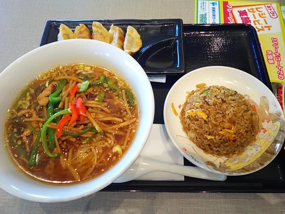 今月中旬の平日昼、かなり久しぶりでの再訪です。フードコートは相変わらずの混雑。店前で無料揚げ餃子券を貰い、青椒肉絲麺と半炒飯、それにぱりぱり揚げ餃子(5個)を注文しました。青椒肉絲麺は中細麺が醤油ベースの清湯に浸り、麺上には細切りのピーマン・シナチク・豚肉の炒め物が載っているものですが、さらにアクセントとして赤パプリカがトッピングされています(刻みネギと白ゴマも浮いている)。旨みと甘みのある清湯でなかなか美味しい。半炒飯は醤油ダレ使用なのか茶色っぽく、炒り玉子に刻み叉焼・ネギ・ニンジンにグリーンピースも混じっています。まあまあな味わい。揚げ餃子は小ぶりですが、パリッとした食感が良いです。完食完飲で満腹となりました。