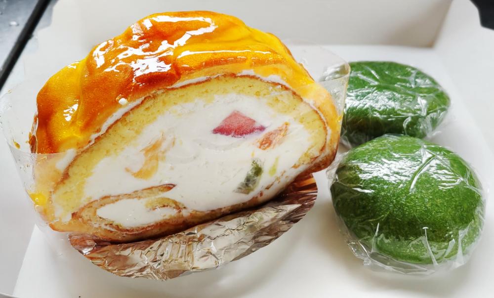 「極上シューロールカット」と春の和菓子「草もち」をいただきました。 シューロールは、カットされたフルーツと生クリームをスポンジとシュー生地で巻いてあるロールケーキです。生クリームは甘さ控えめで、4種類のフルーツの味を楽しめます。 草もちは、よもぎの風味はあまり感じず、中の粒あんは結構甘く感じました。