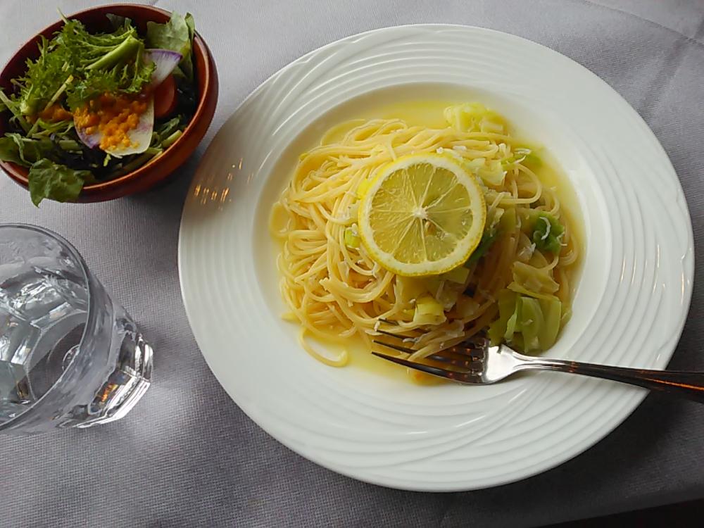 今月下旬の平日昼、また久しぶりに連れと再訪しました。本日のランチから「シラスとキャベツ長ネギのオイルソーススパゲティー」をホットコーヒーとともに選び、併せて本日のドルチェから「ココナッツのブランマンジェ」を注文しました(連れはパンナコッタ)。初めにオリーブ油の浮くサツマイモのポタージュスープと地物野菜のミニサラダ(水菜/香菜/トマト/紫カブ/人参ドレ)が到来。温製ポタージュはサツマイモ特有の甘味が美味しい。次いで到来したメインのスパゲティーは、麺にキャベツと長ネギ、シラスを絡めてあり、中央にはレモンスライス1枚をトッピングしてあります。レモンを絞ってオイルソースに合せると、サッパリとした塩味が美味しい。ドルチェのブランマンジェはとろとろの食感で、パンナコッタのように感じます。カットリンゴとカットオレンジ、イチゴ、生クリームも添えられていて、なかなか華やかな外観。ホットコーヒーとともに美味しくいただきました。