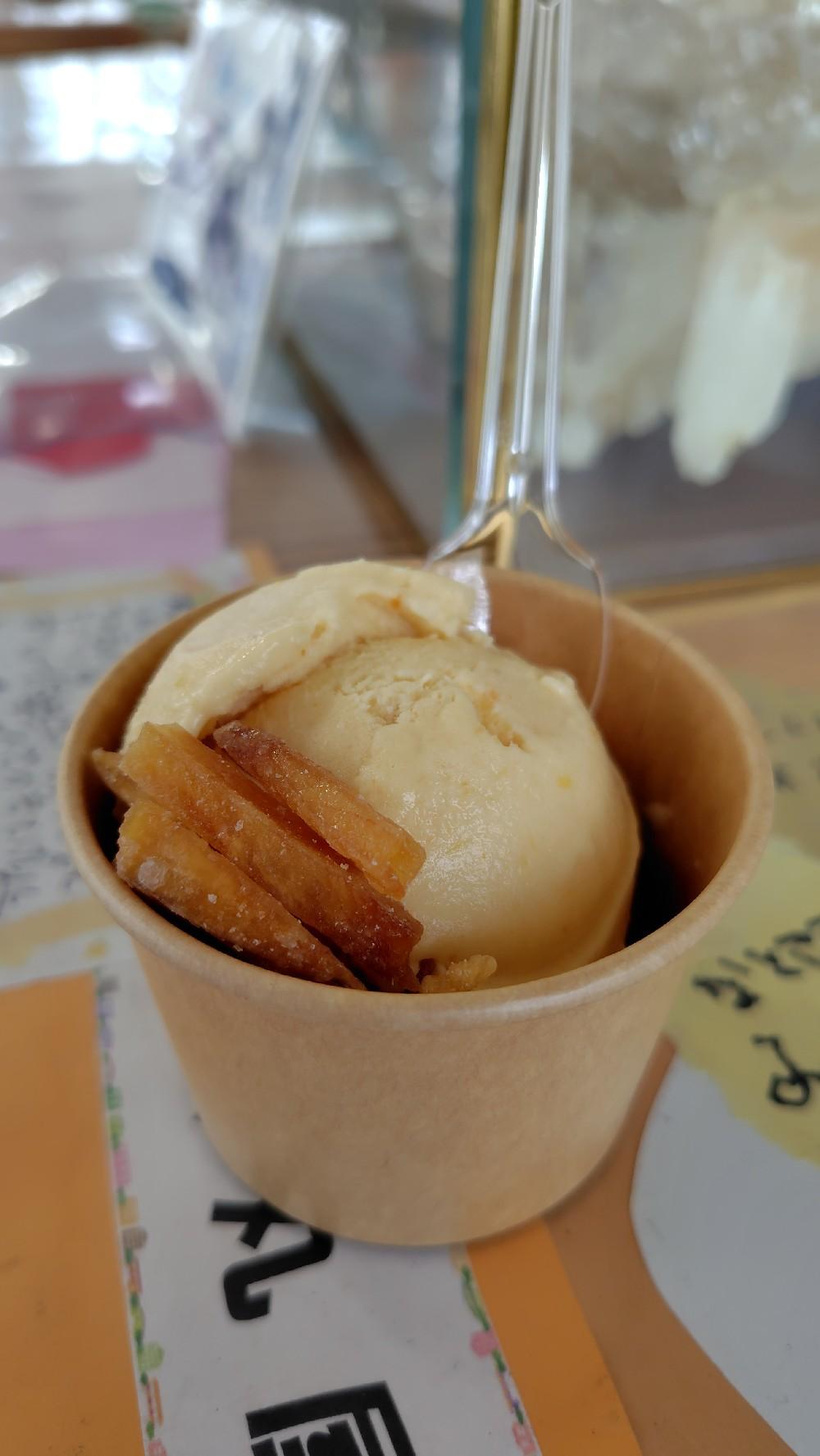 【おいもジェラート】 干しいも専門店ですが、おいもジェラートを食べに行きました。数種類ある中から数量限定と表示があった『栗こがね』という品種のジェラートをいただきました。ジェラートの上には、フライドスイートポテトがのっていました。甘みは強くありませんが、おいもの風味を感じられてとてもおいしかったです。 シングル300円、ダブル500円。店内には座るところがたくさんあるので、店内でいただくことができます。