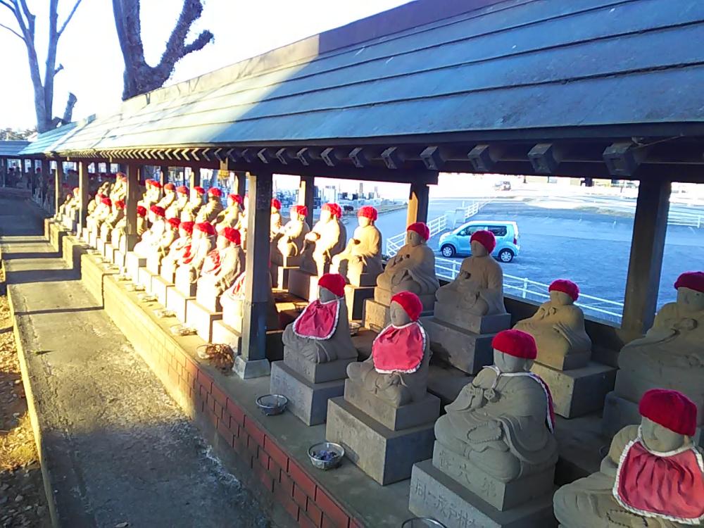 初詣で平日午後に訪れました。小正月も間近な頃ですが、他に訪れる人も殆どなく、ひっそりとしています。それだけに境内のそれぞれ立派な建造物をじっくり眺めることができました。大本堂の裏手に回ると、ほぼ真北方向に筑波山が遠く望めます。恰もこの地から、不動尊のみならず遥か彼方の筑波山をも拝めるように配置したのかな?と思ってしまいました。また大本堂裏手には、四国八十八ヶ所霊場に倣い、江戸時代から信仰されているという谷原大師八十八ヶ所霊場の弘法大師石像が、1番から88番まで並んでおり、なかなかに壮観です。それら御尊顔は凛々しい反面、素朴な表情にも見えて趣があります。また、いずれも赤頭巾を被せられている(赤い前掛けを掛けられているのもちらほら)点で、それぞれの霊場(札所)を預かる各地区の人々にとても大事にされていることがわかり、何かほのぼのとしました。最後は仏籤をひき、今年の運勢を占いました。