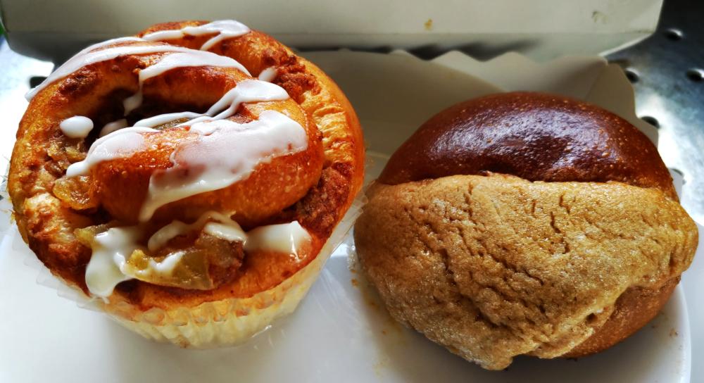 焼きたてパンが並ぶ中から、この季節ならではの、リンゴを使ったシナモンロールと栗の形をしたパンを購入しました。 シナモンロールの中には、スライスしたリンゴが入っていて、食べ応えがありました。 栗パンは、中に栗を使ったクリームが入っていました。 どちらもおいしかったです。