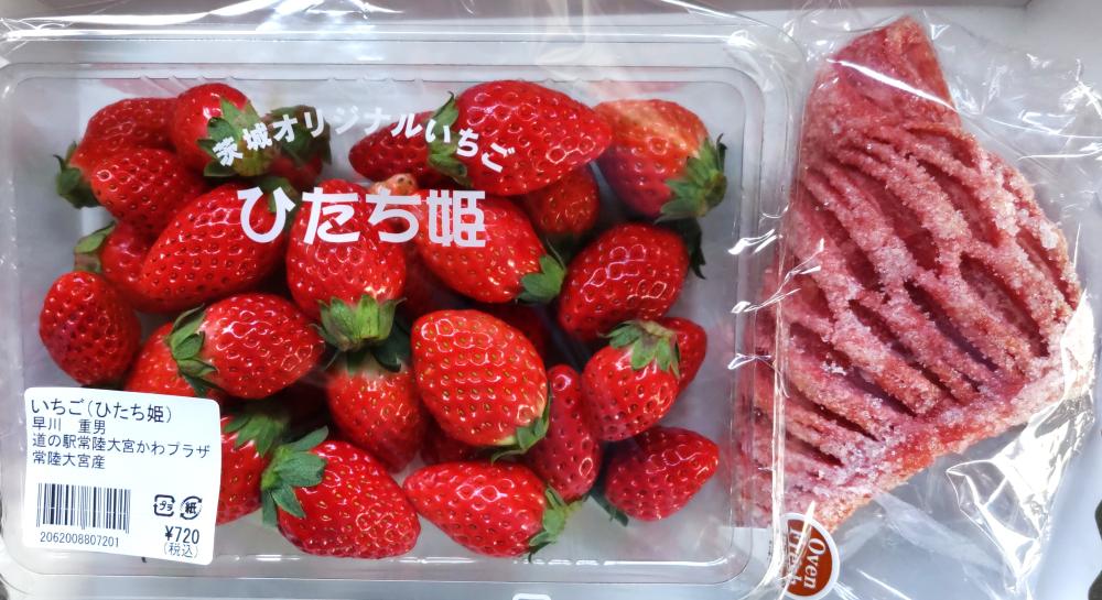 奥久慈いちごフェアが開催されていました。「5」のつく日に、いちごを購入するとスクラッチくじがもらえて、当たるといちご1パックもらえます。そこで、茨城オリジナル品種の「ひたち姫」を購入しました。ひたち姫はサクサクとした食感で、酸味は少なく優しい甘さのいちごです。大きな粒で形の揃ったパックもありましたが、粒が小さく、不揃いで、数の多いお得なパックを購入しました。(くじははずれました。) いちごを使ったパンも販売されていたので購入しました。パイ生地の中に、いちごジャムとカスタードクリームが入ったパンで、甘くておいしかったです。 いちごフェアは4月24日まで開催されています。詳細はHPをご確認ください。