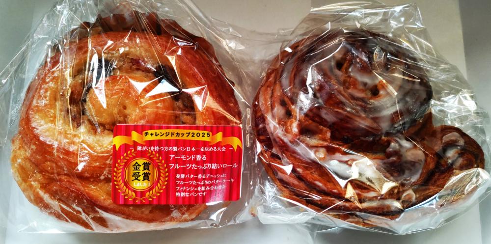 「結いロール」と「シナモンデニッシュ」を購入しました。 「結いロール」は障害者が作るパンの日本一を決める「チャレンジドカップ2025」で、金賞に輝いたパン。デニッシュ生地とバターケーキフィナンシェを合わせたパンで、中にレーズン、クランベリー、オレンジピールなどのフルーツが入っています。(300円) 「シナモンデニッシュ」も2020年くるみパン・オブ・ザ・イヤーのグランプリに選ばれた人気のパン。(200円) どちらもおいしく、おすすめです。